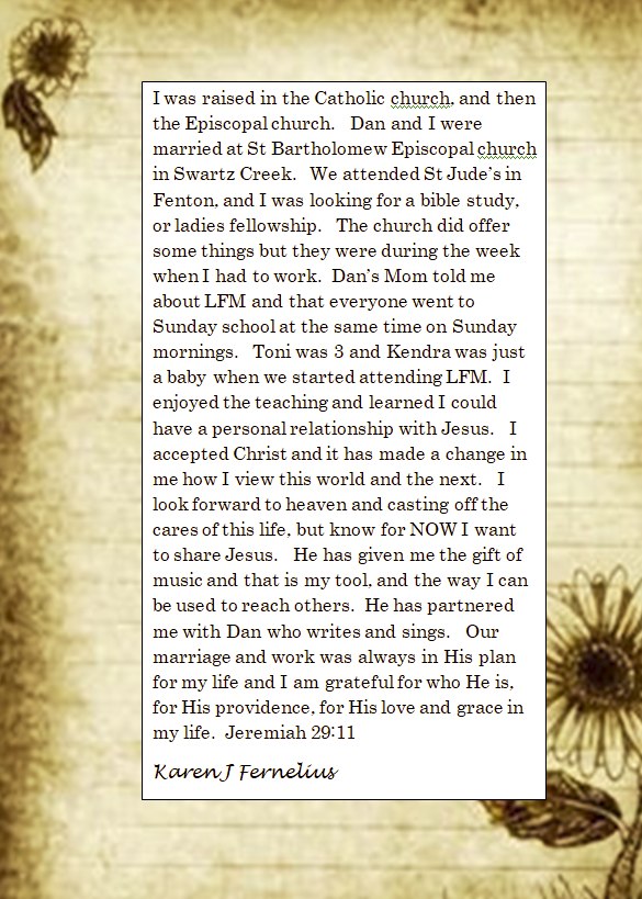 I was raised in the LFM church by wonderful Christian parents. I had to make the choice to follow Jesus. I realized that I needed Him as my savior when I was 21 years old. I made starts many times, but this time I knew that that I would follow through. I have made mistakes but God never gives up on me . There have been many times throughout my life that the only reason I survived was by God's grace. I am an old man now and would not want to go through the rest of my life without Jesus.